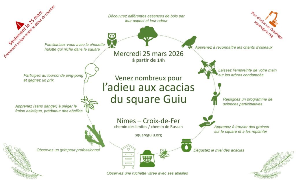 Cet événement est organisé par l’association SAUVONS LE SQUARE GUIU avec le GNSA (Groupe National de Surveillance des Arbres) et le comité nîmois des SDT (Soulèvements de la Terre), associations engagées pour la protection de l’environnement présentes pour échanger avec vous.
