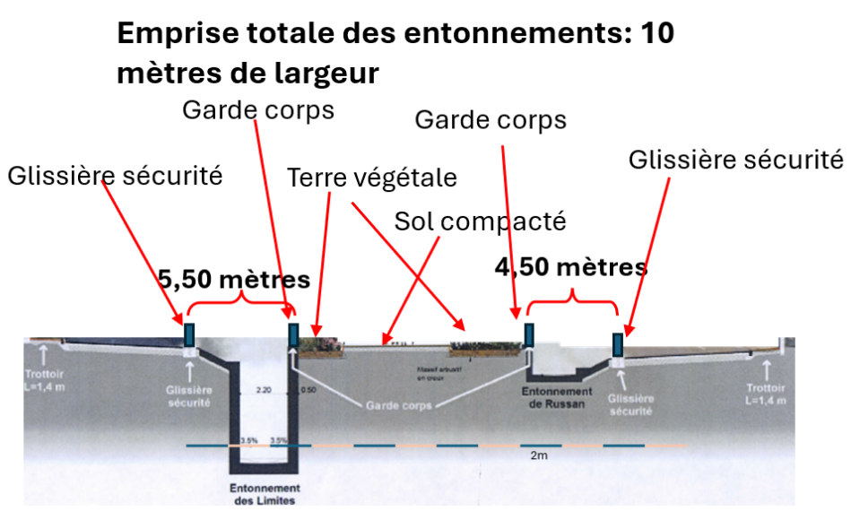 Les ouvrages sont calibrés pour contenir 17,5 m3/s sur le chemin des limites et 4,5 m3/s sur le chemin de Russan. Ils rejoignent le tunnel souterrain traversant la ville, ce dernier ayant une capacité de 80 m3/s.
